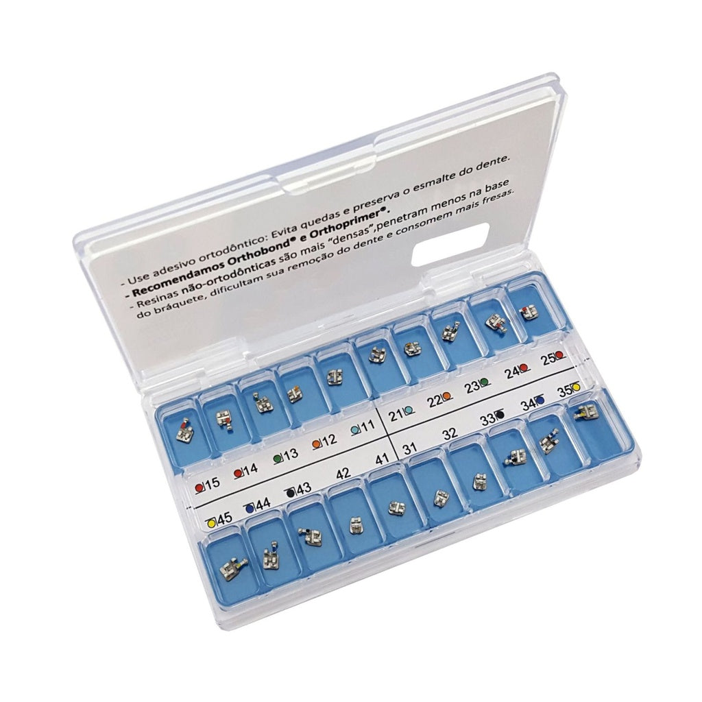 Base with cervico-occlusal and mesiodistal curvatures, which improve tooth attachment during bonding. Molded base with square, sandblasted pins, where recent tests have proven superior bond strength to mesh-based brackets. "Deep-grooved" jaws for better accommodation of elastic ligatures and ties. Central "V" marking for easier instrument positioning and bracket alignment along the axis of the teeth during bonding. Slot with rounded edges that favor the movement of the arches, even in cases of severe crowding and unevenness.