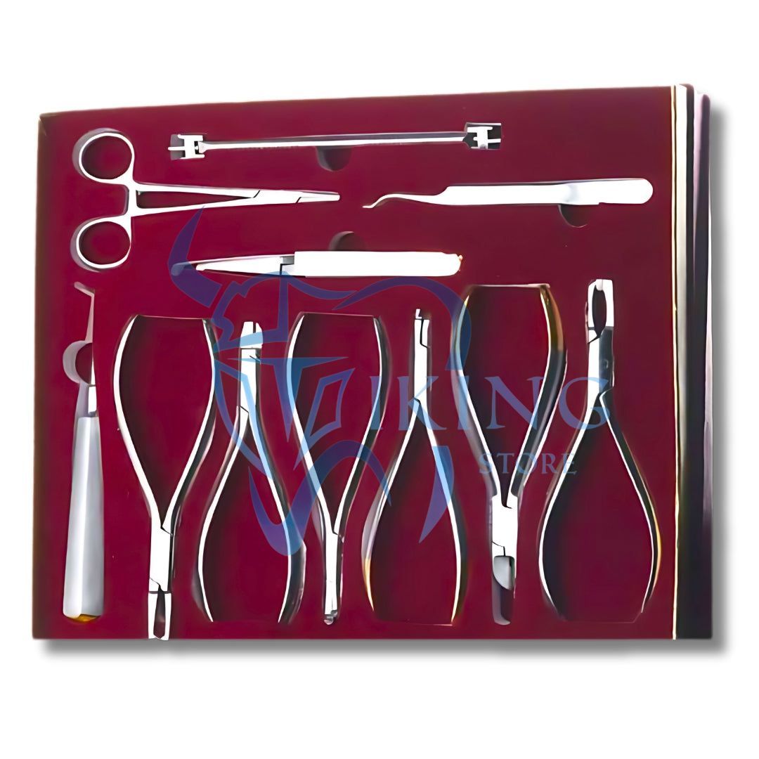 1- Distal End Cutter HQ 2- Straight Heavy Cutter 3- Crimpable Hook Plier 4- Band Removing Plier 5- Cinch Back Plier 6- Bracket Removing Plier 7- Bracket Holder 8- Tube Holder 9- High Quality Mosquito 10- Movable Bracket Positioner 11- Band Pusher |